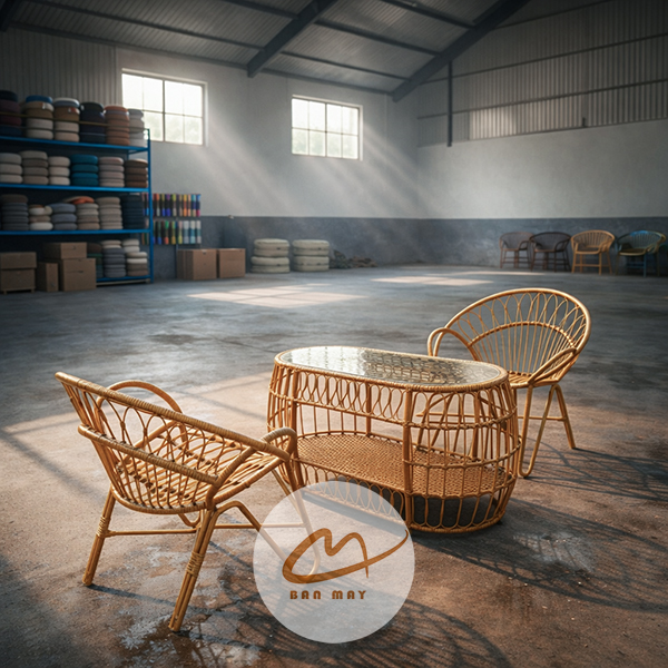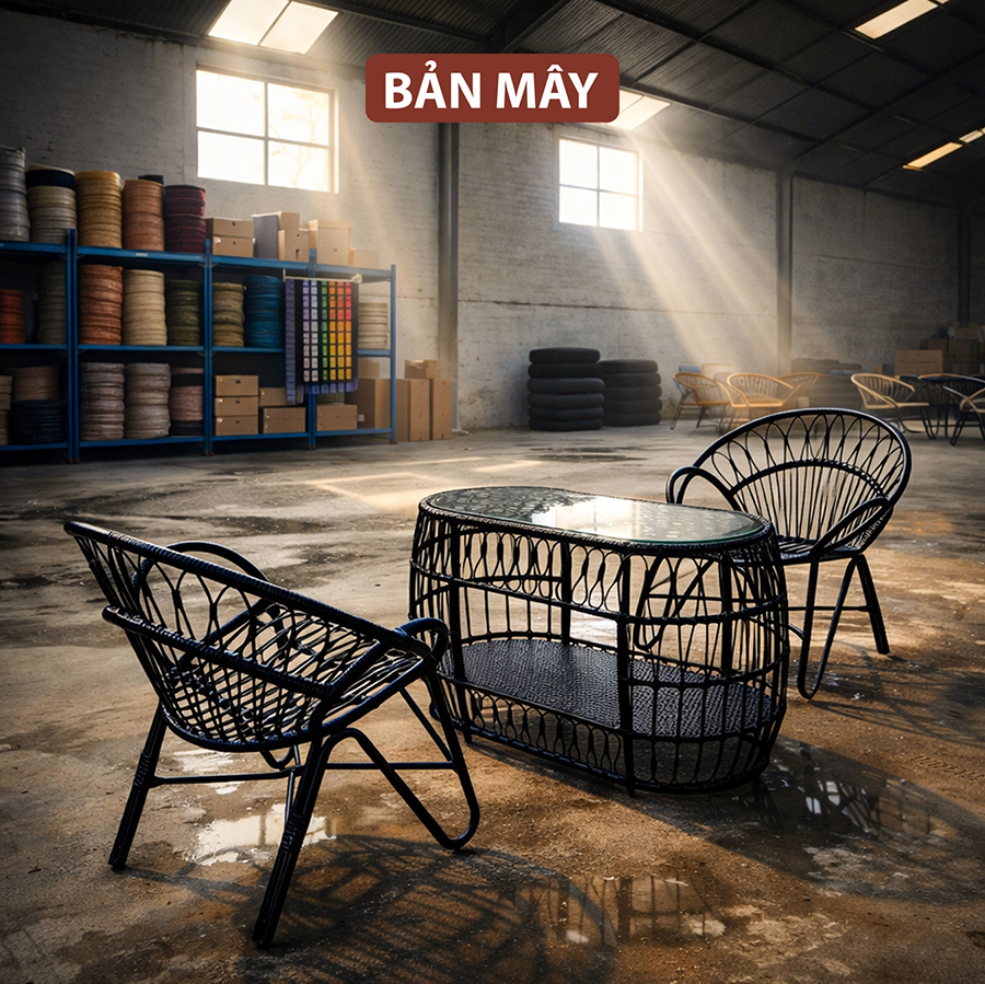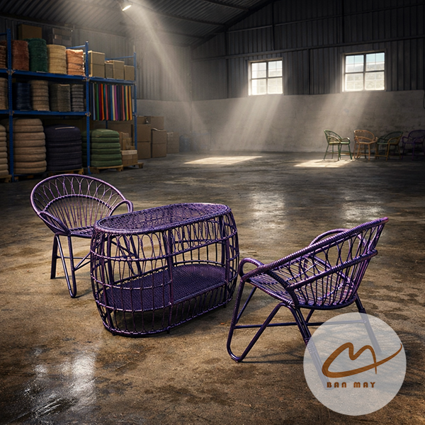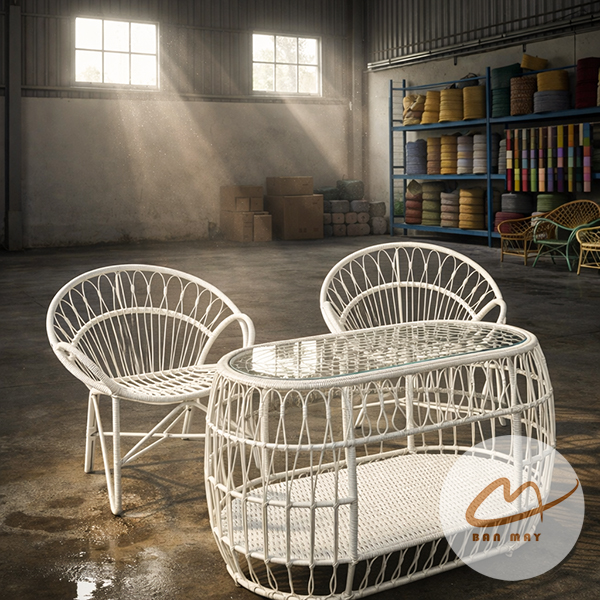 Quy trình chế tác thủ công tỉ mỉ tại xưởng Bản Mây giúp bộ bàn ghế mây nhựa luôn giữ được phom dáng chuẩn "đuôi công", tạo điểm nhấn kiêu sa cho góc ban công nhỏ hay hiên nhà của bạn. Với khả năng tùy chỉnh màu sắc và đệm nhung êm ái, bộ sản phẩm là sự kết hợp hoàn hảo giữa thẩm mỹ, công năng và độ bền bỉ theo năm tháng.