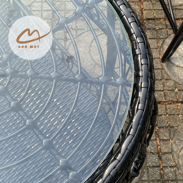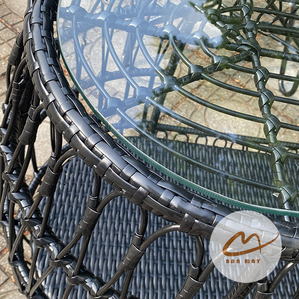 Sự cuốn hút ngay từ cái nhìn đầu tiên của bộ bàn ghế mây nhựa này nằm ở kiểu dáng đuôi công ấn tượng. Phần tựa lưng của ghế được đan theo kiểu lưới giả mây mảnh mai, uốn lượn mềm mại như những sợi lông phượng hoàng, tạo nên sự thoáng đãng nhưng vẫn vô cùng chắc chắn. Kiểu đan này không chỉ mang lại tính thẩm mỹ cao, gợi nhớ đến những mẫu ghế xích đu Phượng Hoàng đôi kinh điển, mà còn tạo cảm giác nhẹ nhàng, dễ dàng hòa mình vào mọi bối cảnh sân vườn hay hiên nhà.