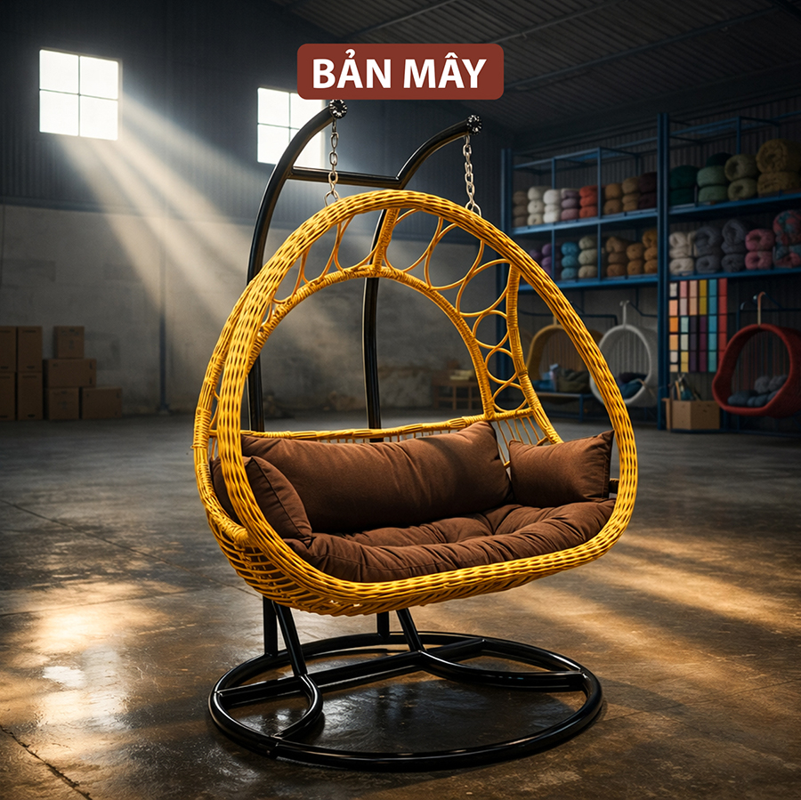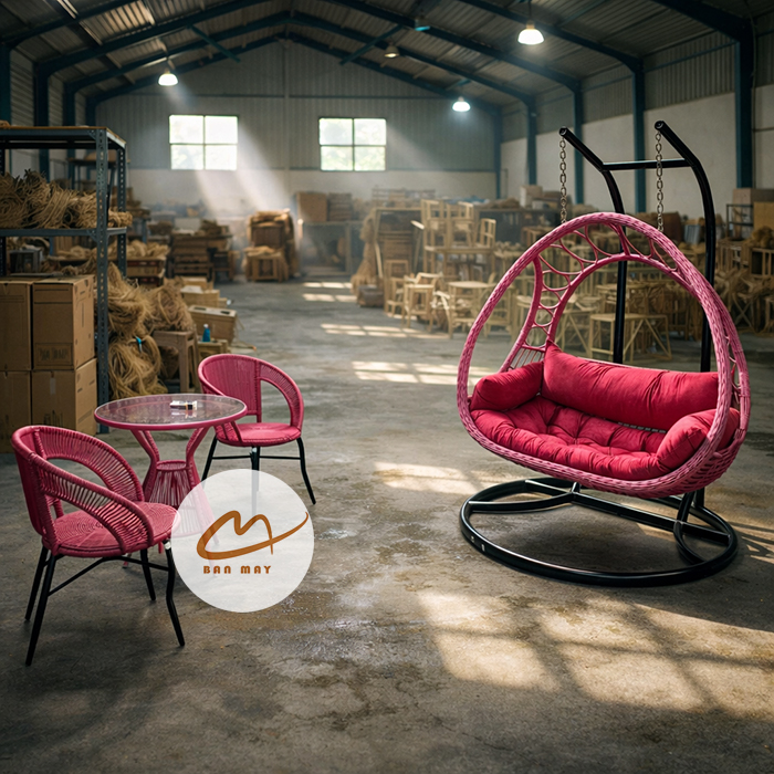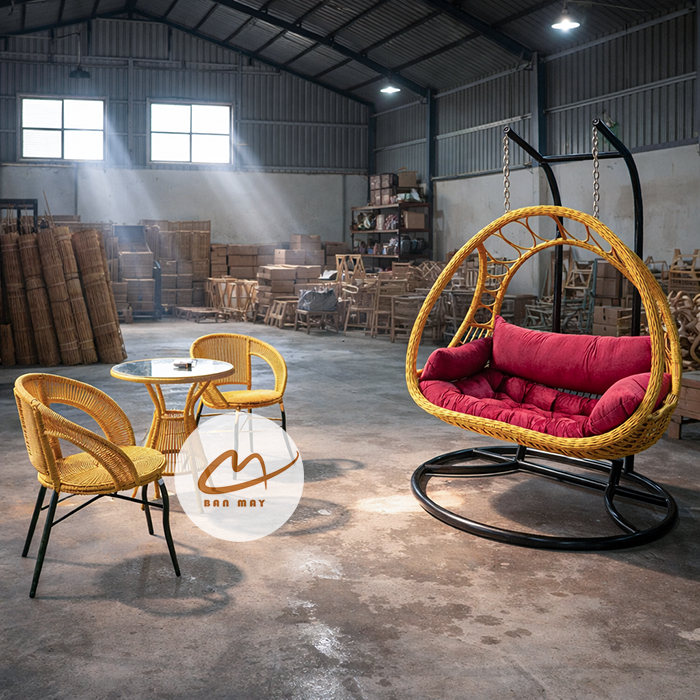 Bàn ghế ngoài trời, xích đu mây nhựa khung thép nội thất Bản Mây ngồi được 3 người đan thủ công cao cấp