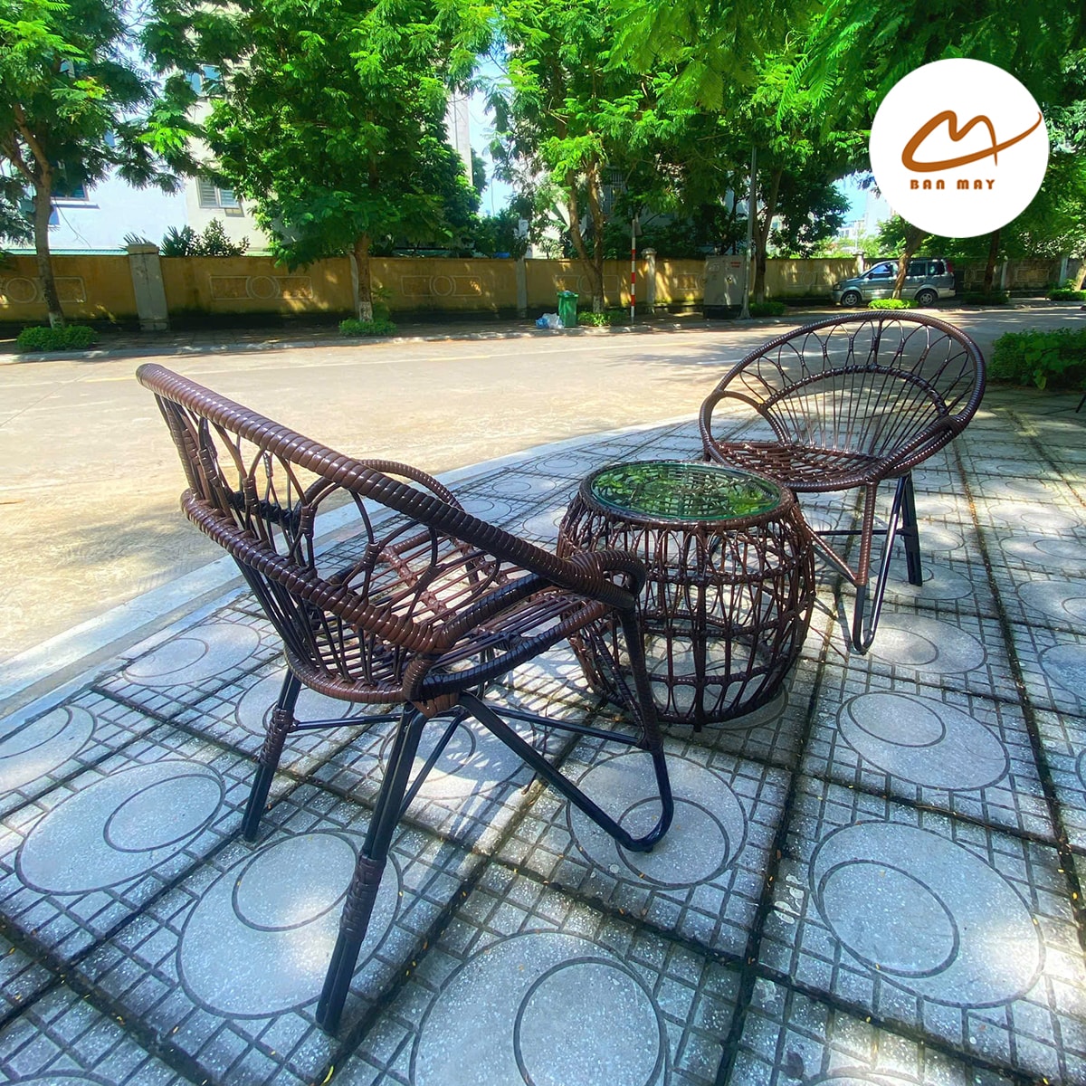 Combo gồm 2 ghế + 1 bàn, đủ cho một góc ngồi hai người dùng hằng ngày. Đây là kiểu set rất hợp cho gia đình thích một góc trà sáng, góc đọc sách hoặc nơi tiếp một vị khách thân quen mà không cần bày biện quá nhiều. Sự khác biệt của mẫu này nằm ở cảm hứng thiết kế đuôi công và cách phối giữa khung đen với mây nhựa màu nâu sẫm. Nhìn tổng thể, bộ bàn ghế mây nhựa cho cảm giác vừa thủ công vừa sang, không bị quá rustic nhưng cũng không lạnh theo kiểu công nghiệp.