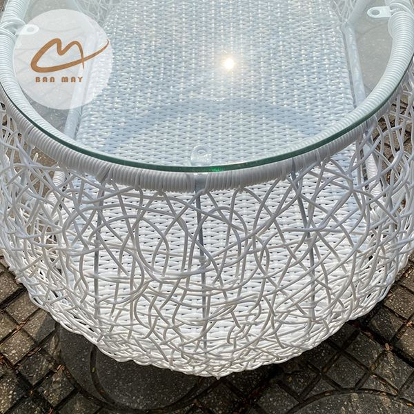 Bàn có kích thước 90 x 40 x 65cm, đủ để làm bàn trà, bàn decor hoặc bàn đặt đồ dùng cơ bản cho hai người. Phần mặt kính cường lực siêu trong giúp tổng thể nhìn sáng và sạch hơn, đồng thời rất tiện lau chùi sau khi sử dụng. So với các mẫu bàn đan kín mặt, bàn kính giúp bộ bàn ghế mây nhựa có vẻ hiện đại và thoáng hơn rõ rệt.