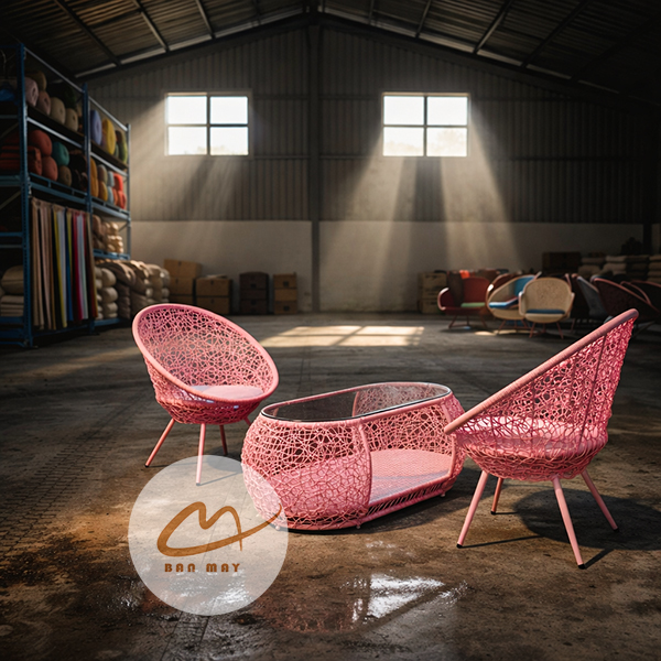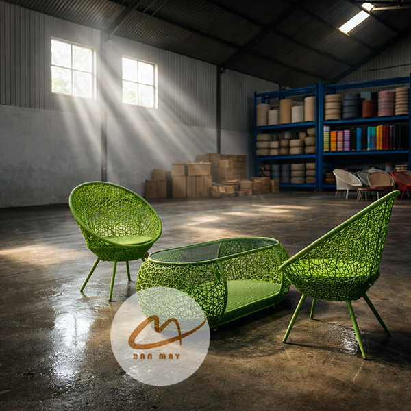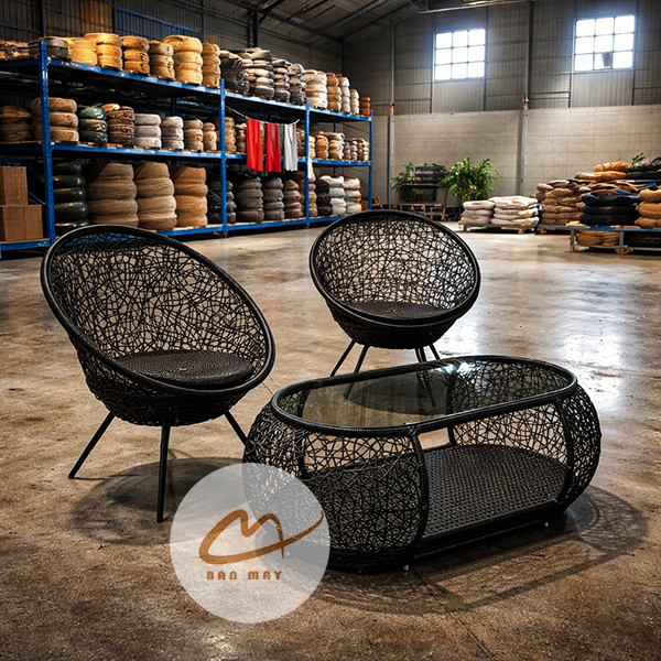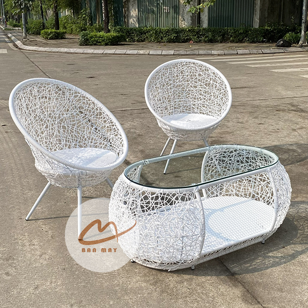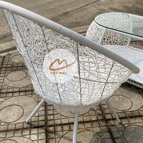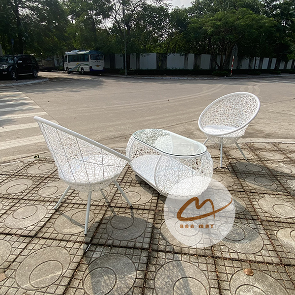 Phần khung ghế dùng thép sơn tĩnh điện, tạo độ chắc và giữ phom tốt. Bên ngoài là nhựa nguyên sinh giả mây, cho bề mặt đẹp, dễ vệ sinh và bền hơn trong điều kiện sử dụng ngoài trời có mái che. Sự kết hợp này giúp bộ bàn ghế mây nhựa vừa có chất thẩm mỹ của đồ đan tay, vừa có độ ổn định của vật liệu hiện đại. Nếu muốn phối thêm một món thư giãn cùng tinh thần vật liệu, có thể tham khảo xích đu giọt nước.