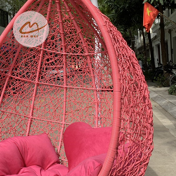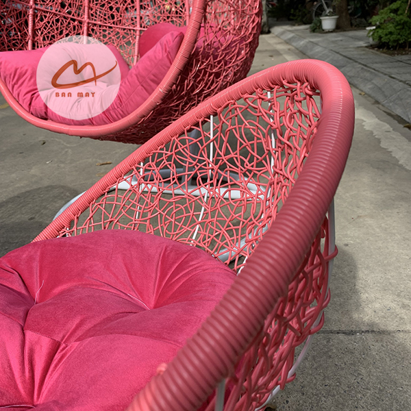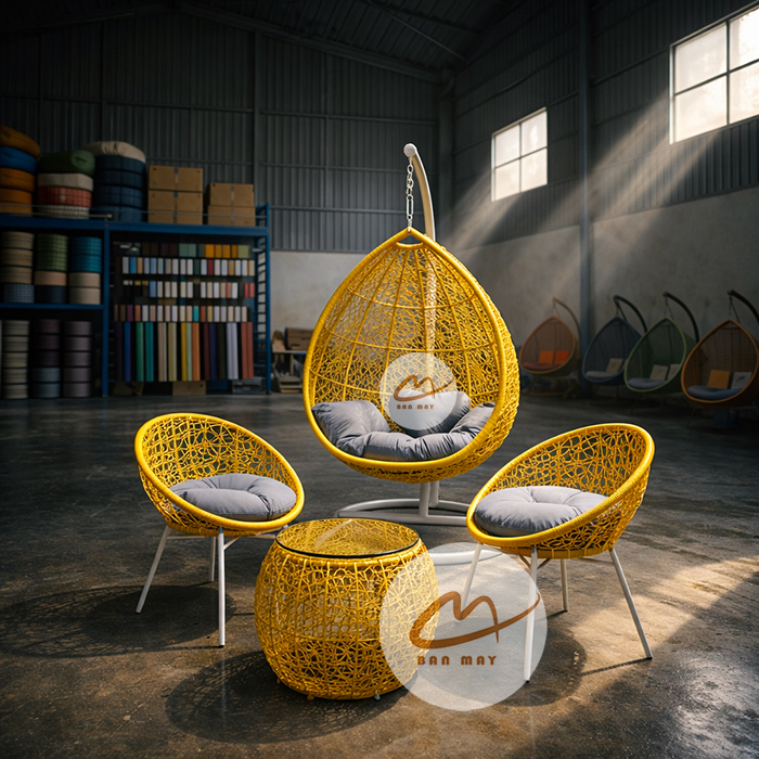 Phần lồng xích đu và thân ghế, bàn được đan tay thủ công tỉ mỉ bằng sợi nhựa nguyên sinh giả mây cao cấp. Khác với các dòng nhựa tái chế giá rẻ trên thị trường dễ bị giòn gãy, sợi nhựa nguyên sinh của Bản Mây có độ dẻo dai vượt trội và được tích hợp hoạt chất kháng tia UV cường độ cao. Điều này đảm bảo bộ xích đu mây nhựa luôn giữ được độ đàn hồi và màu sắc tươi mới nguyên bản dù phải tiếp xúc trực tiếp với nắng mưa hàng ngày. Đây là minh chứng rõ nét cho dòng xuất xưởng từ Bản Mây.