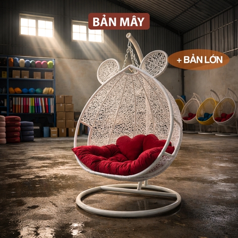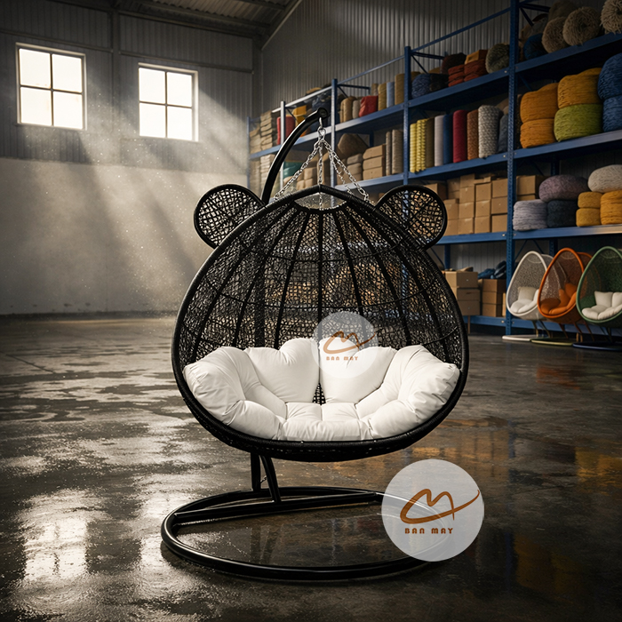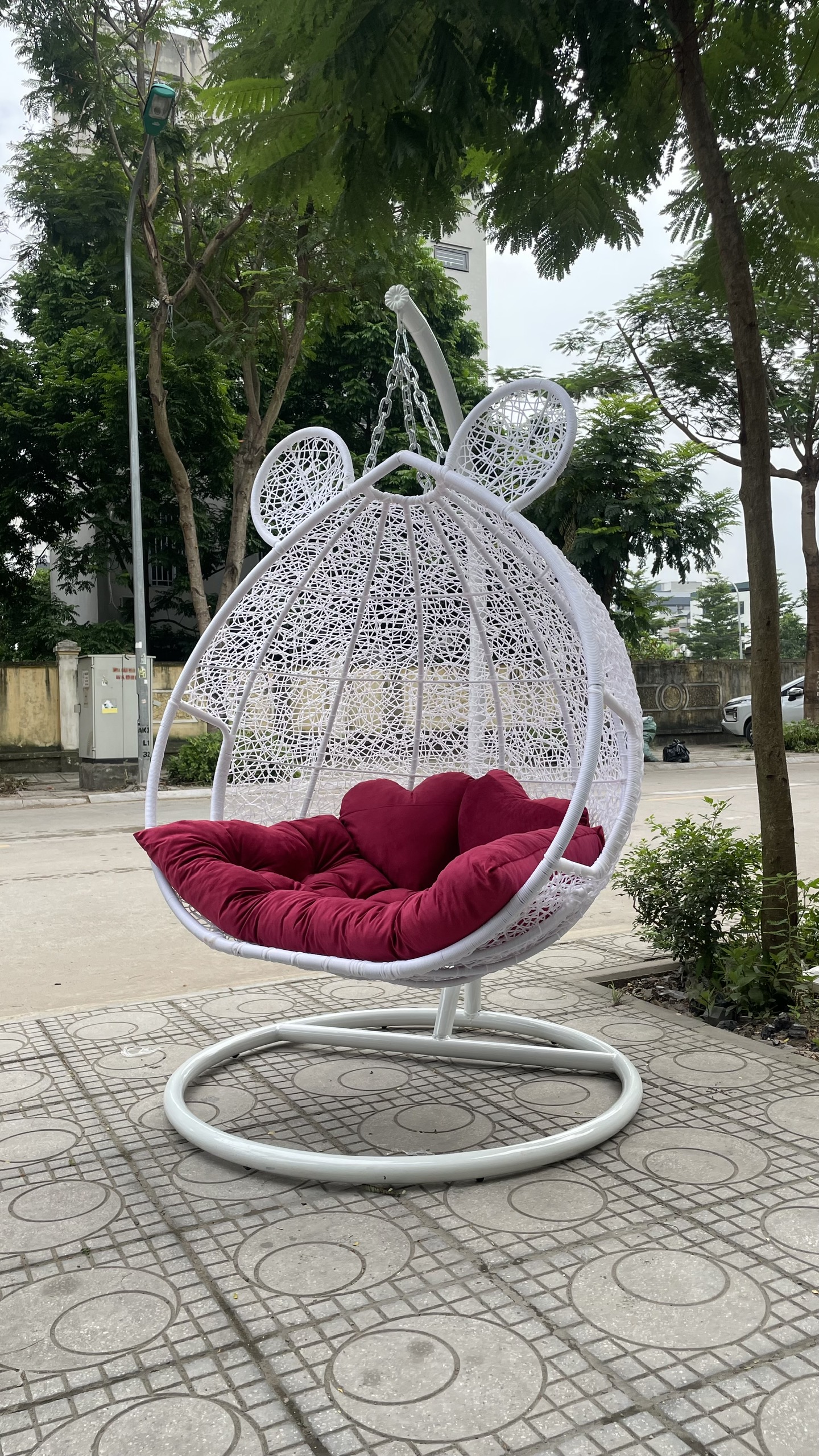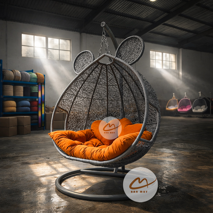 Trong thế giới nội thất ngoài trời, không phải mẫu nào cũng có “cá tính” rõ ràng. Phiên bản ghế xích đu đôi tai gấu tạo khác biệt ngay từ hình khối: phần đỉnh lồng được thiết kế thêm hai chi tiết tròn đối xứng, tạo hình tai gấu mềm mại. Chi tiết này giúp sản phẩm trở thành điểm nhấn nhận diện, dễ nhớ và khác biệt hoàn toàn so với các form giọt nước truyền thống.