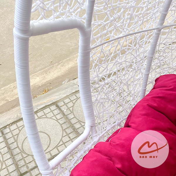 Với chiều cao khung 2m và lồng rộng 1m3, mẫu ghế xích đu sắt này giữ được tỷ lệ gọn nhưng vẫn đủ cho 2 người ngồi cạnh nhau. Khung đơn thép sơn tĩnh điện nhiều lớp tạo đường cong thanh thoát. Phần cần cong nâng đỡ lồng đúng trục trọng tâm, giúp chuyển động đung đưa mượt và ổn định.
