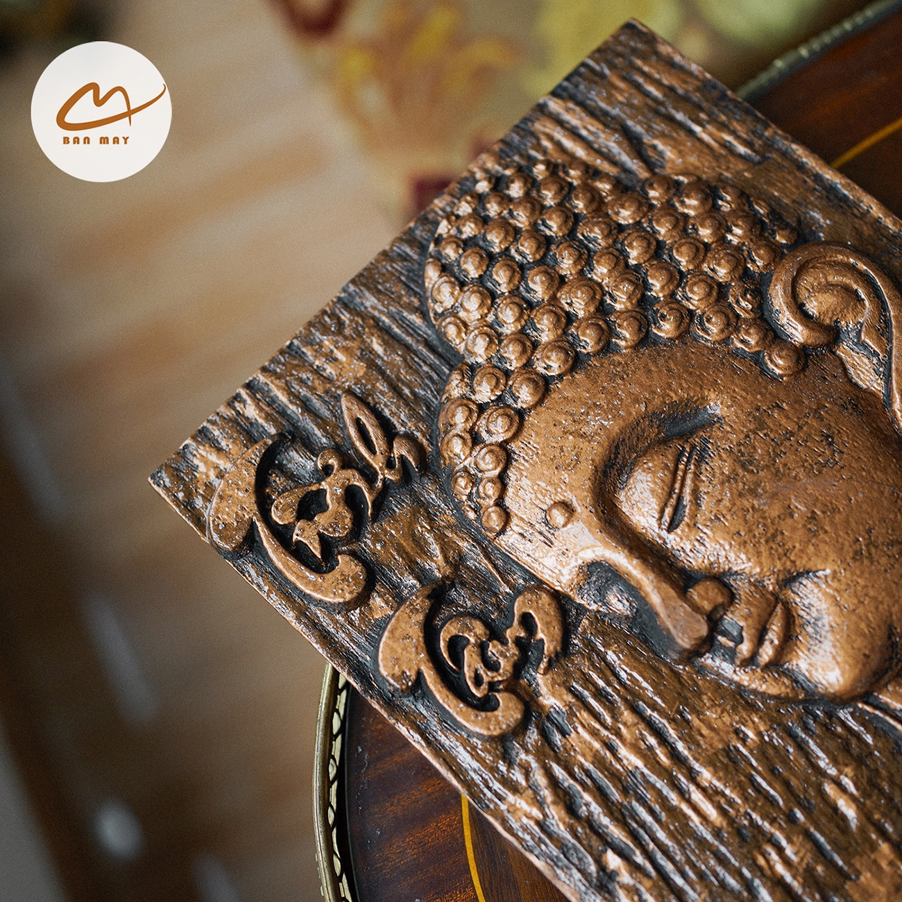 Trung tâm bức phù điêu là hình tượng Đức Phật trong tư thế thiền định, ánh mắt nhắm hờ, nụ cười an nhiên như thể đang chìm đắm trong cõi niết bàn tịch tĩnh. Nét khắc chạm tinh xảo thể hiện từng đường nét trên gương mặt Đức Phật - từ vầng trán cao, đôi mày cong nhẹ, đến chiếc mũi thanh tú và đôi môi mỏng hiền hòa. Đặc biệt, đôi tai dài biểu trưng cho trí tuệ và sự từ bi được khắc họa một cách tỉ mỉ, càng làm tăng thêm vẻ uy nghiêm mà không kém phần gần gũi của Người.