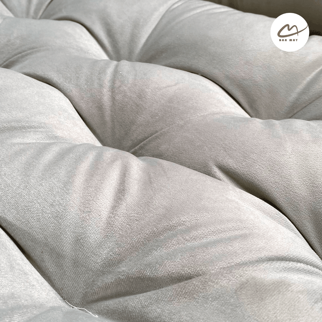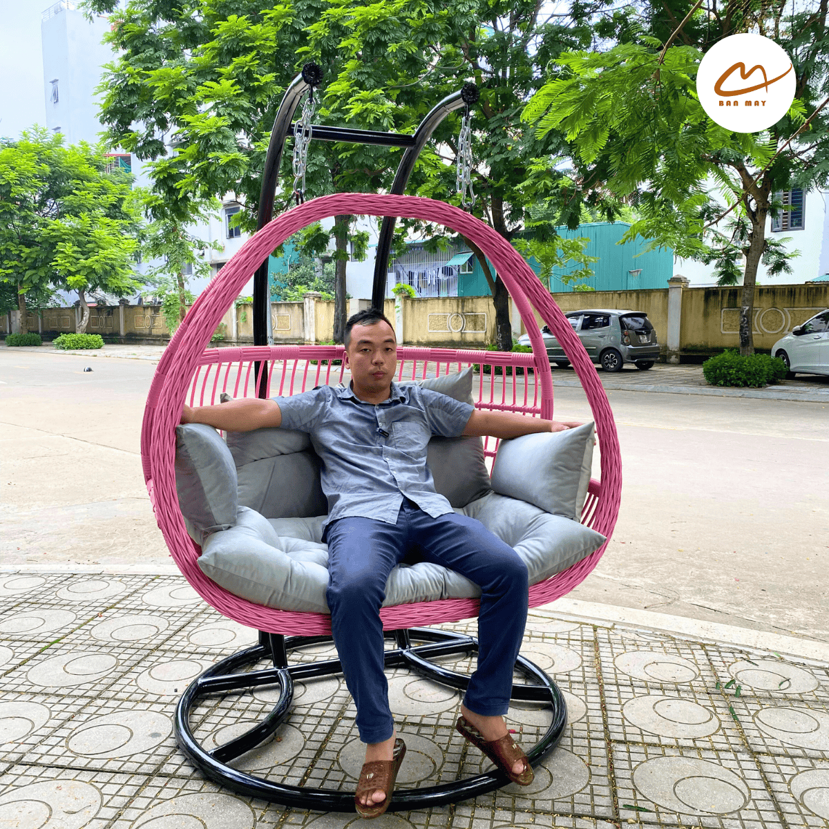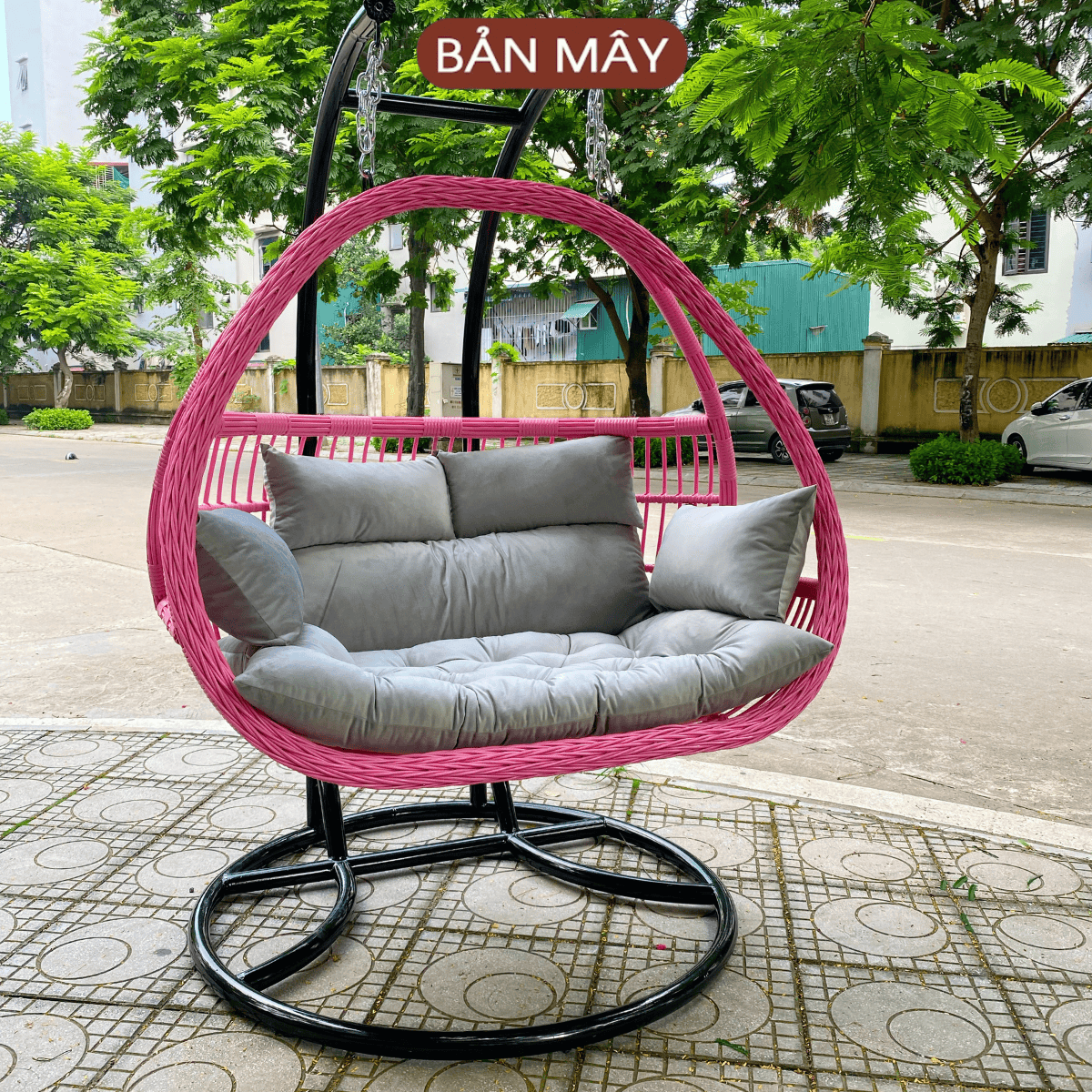 Để nâng niu cảm giác người ngồi, Bản Mây chọn chất liệu nhung xám cho phần đệm đi kèm – một sự kết hợp vừa hài hòa, vừa thời thượng. Màu xám trung tính giúp trung hòa sắc hồng nổi bật, đồng thời làm nổi lên những đường đan tỉ mỉ thủ công của phần lồng. Đệm được nhồi bông hạt trắng cao cấp, tạo độ đàn hồi tốt, không xẹp lún sau thời gian dài sử dụng. Khi tựa lưng vào, bạn sẽ cảm nhận rõ sự nâng đỡ nhẹ nhàng và thư giãn trọn vẹn mà chiếc xích đu này mang lại. Ngoài ra, Bản Mây cũng chuẩn bị sẵn bảng màu lên tới 55 lựa chọn để bạn dễ dàng thay đổi đệm theo phong cách cá nhân.
