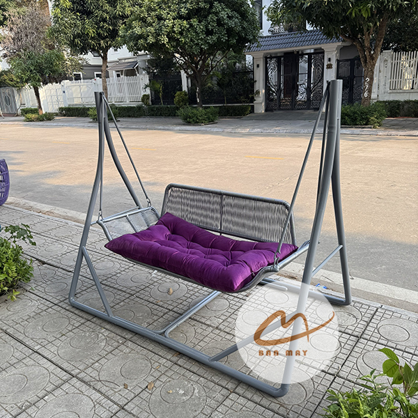 Đệm nhung cao cấp 2 lớp nhồi 100% bông hạt trắng giúp tăng độ êm ái và giữ form lâu dài. Màu đệm có thể tùy chỉnh để phù hợp với phong cách tổng thể của không gian. Dây treo chắc chắn kết nối ghế với khung A, tạo chuyển động đung đưa nhẹ nhàng. Khi sử dụng ngoài sân vườn, chiếc xích đu mang lại cảm giác thư giãn tự nhiên giống như một chiếc võng nhưng ổn định hơn.