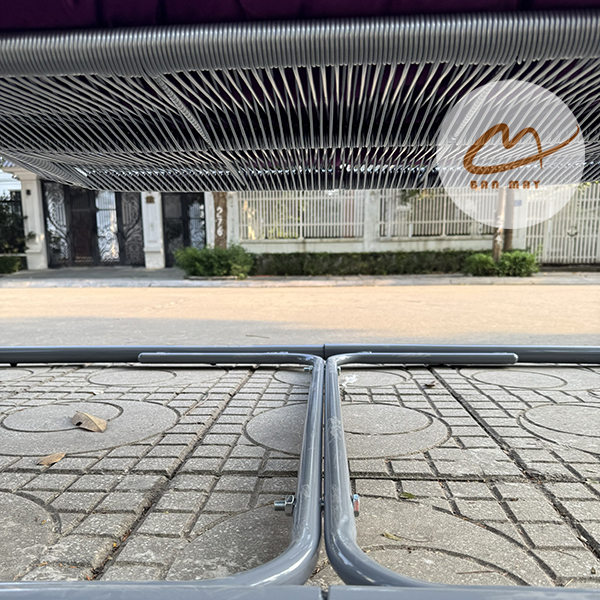 Điểm đặc trưng của mẫu xích đu sân vườn này nằm ở bộ khung chữ A hai bên. Cấu trúc này giúp phân bổ lực đều xuống mặt sàn và giữ cho ghế treo luôn ổn định khi chuyển động. Khung thép sơn tĩnh điện nhiều lớp có khả năng chống gỉ và chịu lực tốt. Phần khung có thể tùy chỉnh màu sắc để phù hợp với không gian sân vườn hoặc hiên nhà.