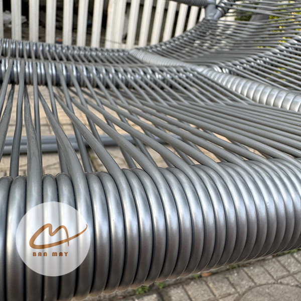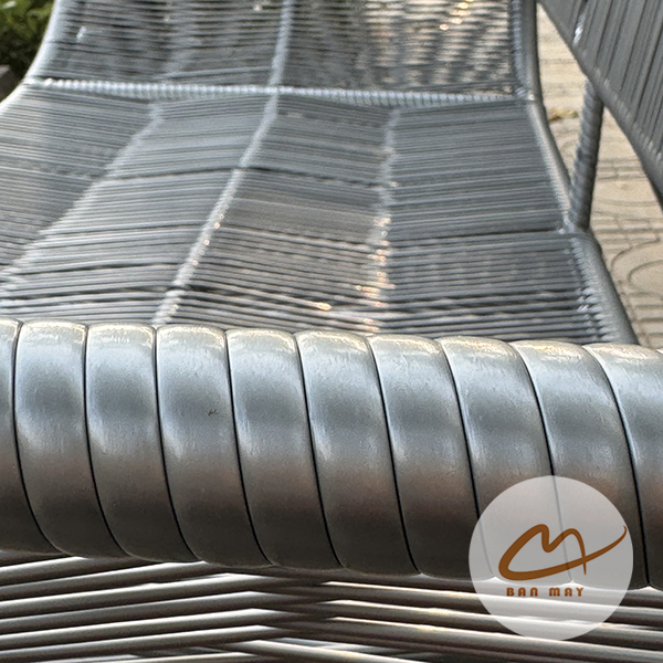 Phần lồng ghế sử dụng kỹ thuật đan dây song song, một kiểu đan thường thấy trong các mẫu ghế dài hoặc sofa mây nhựa. Các sợi nhựa nguyên sinh giả mây được căng song song theo chiều ngang và chiều dọc, tạo bề mặt chắc chắn và thoáng.