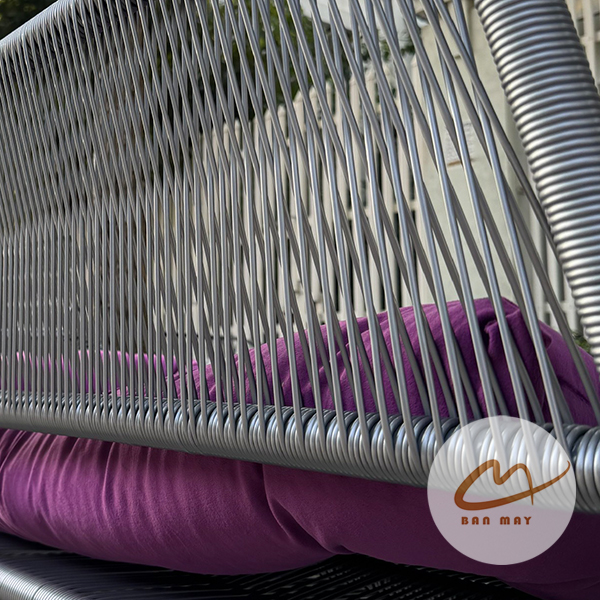 Lớp đan được thực hiện trên khung thép sơn tĩnh điện, tạo nên kết cấu chắc chắn và bền bỉ. Nhựa nguyên sinh giả mây có khả năng chống tia UV và ít bị phai màu khi sử dụng lâu dài ngoài trời.