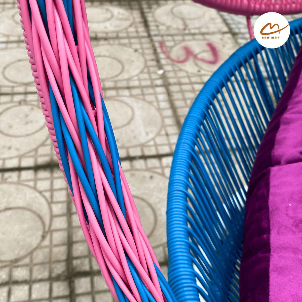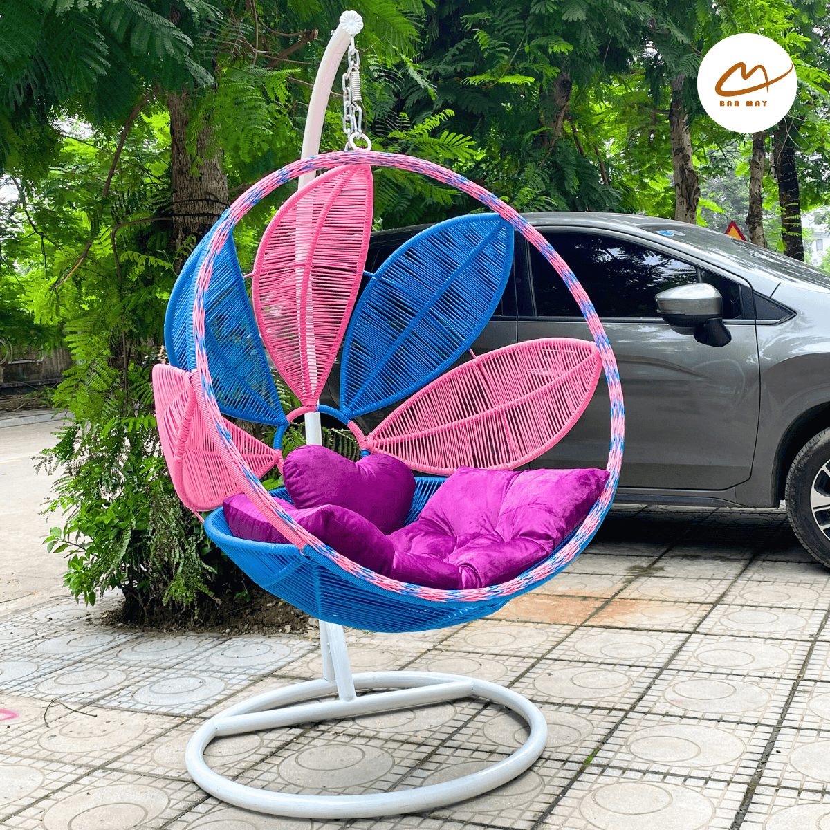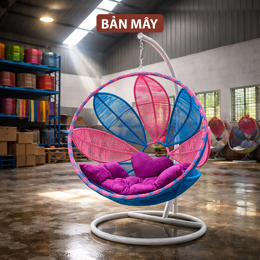 Trong các dòng nội thất mây nhựa hiện đại, yếu tố màu sắc ngày càng đóng vai trò quan trọng trong việc tạo nên phong cách cho không gian. Mẫu ghế xích đu lá nghệ thuật là sự kết hợp giữa thiết kế lồng tròn quen thuộc và bố cục phối màu sáng tạo. Những mảng màu xanh, hồng và tím được sắp xếp thành hình lá đối xứng bên trong lồng ghế, tạo nên cảm giác như một bông hoa hay tán lá đang mở ra. Khi đặt trong sân vườn hoặc ban công, chiếc ghế trở thành một điểm nhấn thị giác đầy năng lượng.