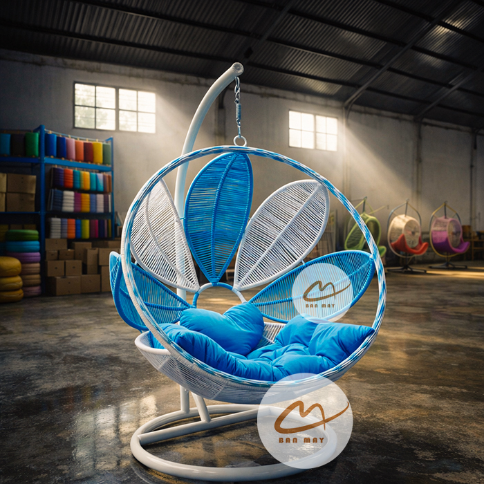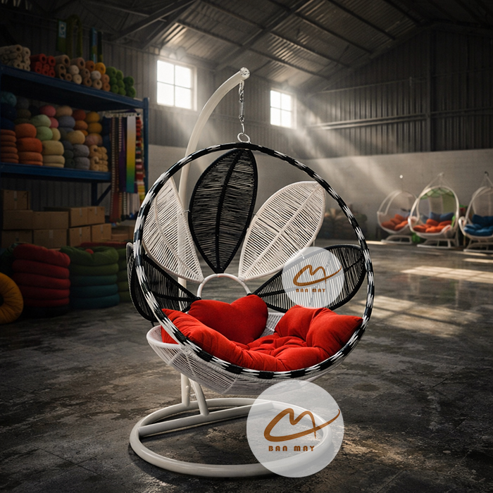 Mẫu ghế xích đu lá nghệ thuật mang đến sự kết hợp hài hòa giữa thiết kế sáng tạo và công năng thư giãn. Với hình khối lá độc đáo, màu sắc nổi bật và lớp đan mây bền bỉ, sản phẩm giúp không gian sân vườn hoặc ban công trở nên sinh động và đầy cảm hứng.