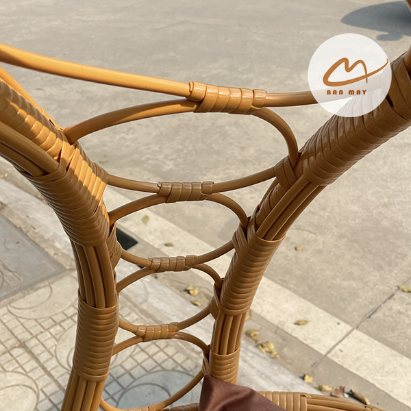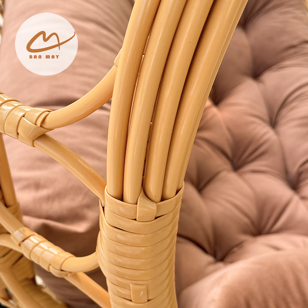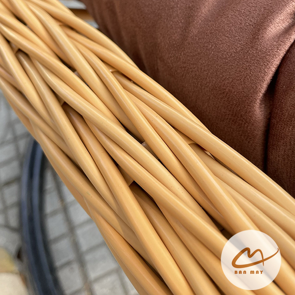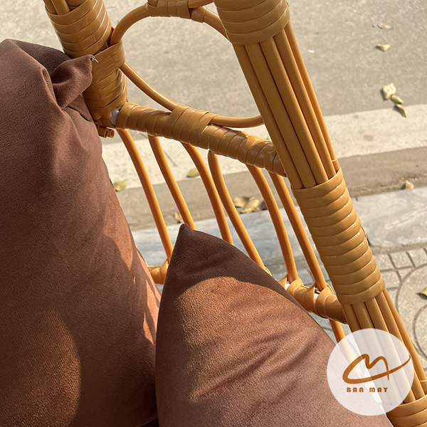 Phần lồng thép đan nhựa nguyên sinh giả mây màu vàng mây tạo cảm giác gần gũi, tự nhiên. Kỹ thuật đan song mây kết hợp viền vảy rồng làm nổi bật đường cong bán nguyệt, tạo chiều sâu thị giác rõ ràng.