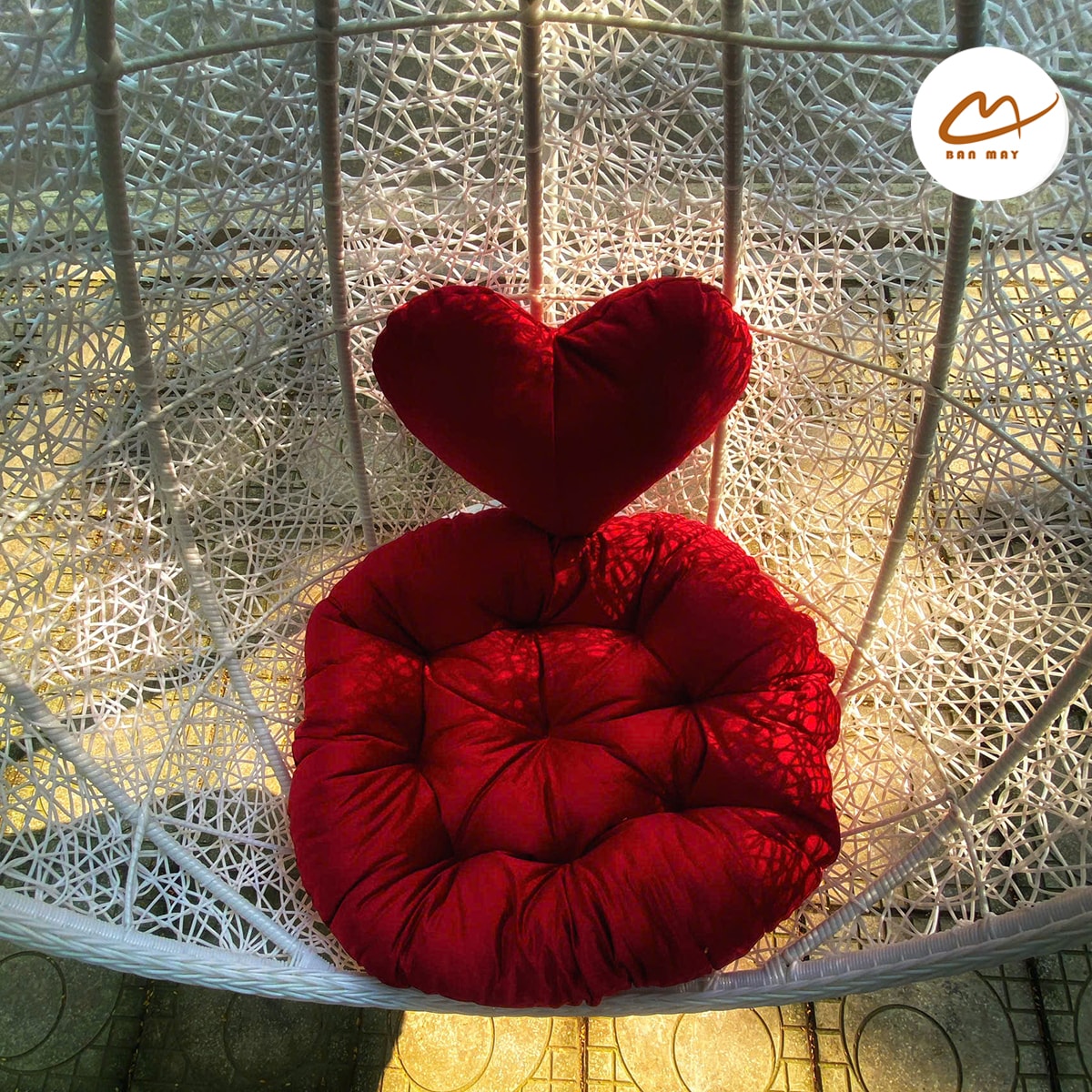 Thiết kế lồng đan rối bo viền tai gấu tạo cảm giác gần gũi, dễ thương. Toàn bộ phần khung và lồng được phủ sắc trắng tinh tế, dễ dàng kết hợp với nội thất hiện đại, phong cách tối giản, Scandinavian hoặc vintage. Màu trắng không chỉ mang lại cảm giác sạch sẽ, thoáng sáng mà còn giúp xích đu trở thành điểm nhấn nhẹ nhàng trong không gian sân vườn, ban công hay góc đọc sách trong nhà.