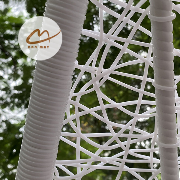 Nhựa nguyên sinh giả mây được sử dụng có khả năng chống tia UV và ít bị giòn gãy khi tiếp xúc môi trường nắng nóng. Đây là yếu tố quan trọng đối với một mẫu xích đu tổ chim đặt ngoài trời. Đan rối dài tạo độ che phủ cao hơn so với kiểu đan mắt cáo. Khi ngồi vào, người dùng có cảm giác được bao quanh bởi một “vỏ kén” nhẹ, tăng độ riêng tư mà vẫn thoáng khí.