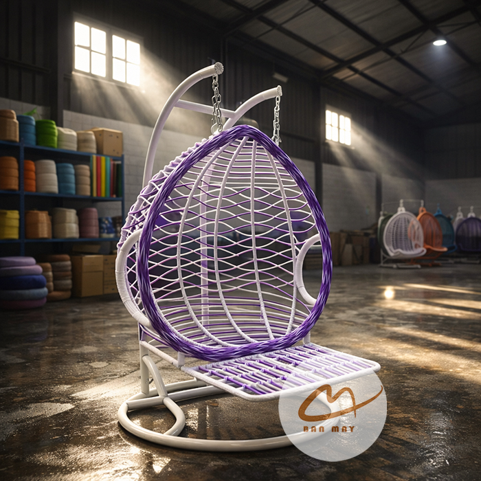 Đan phối 2 màu giúp tổng thể không đơn điệu. Phần khung lồng có thể lựa chọn tông sáng, trong khi lớp song mây lượn sóng tạo hiệu ứng chuyển sắc hoặc tương phản nhẹ. Nhựa nguyên sinh giả mây có độ bền màu tốt và ít bị giòn khi tiếp xúc nắng gió. Điều này giúp mẫu xích đu ngoài trời duy trì thẩm mỹ lâu dài trong môi trường ngoài trời.