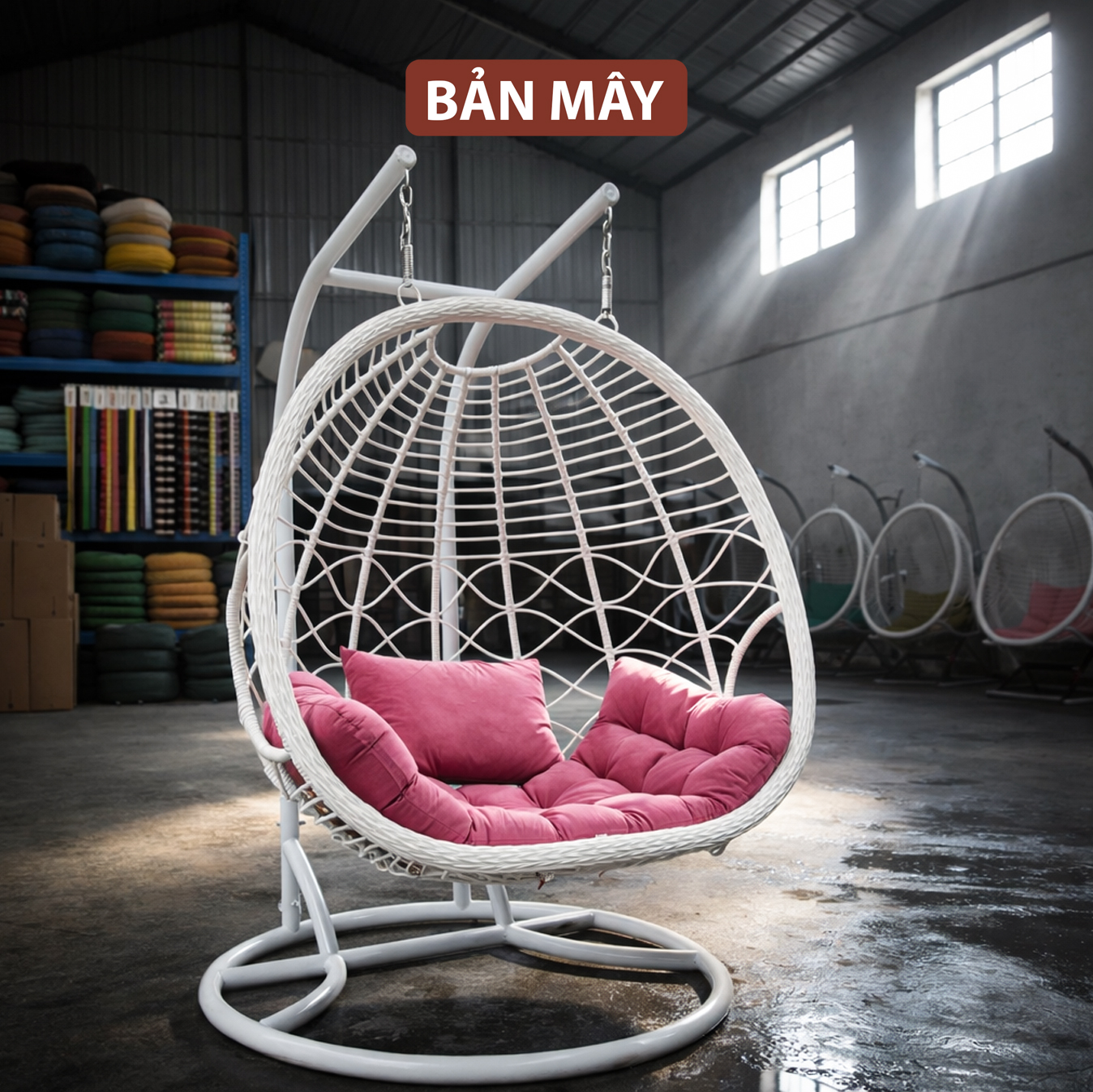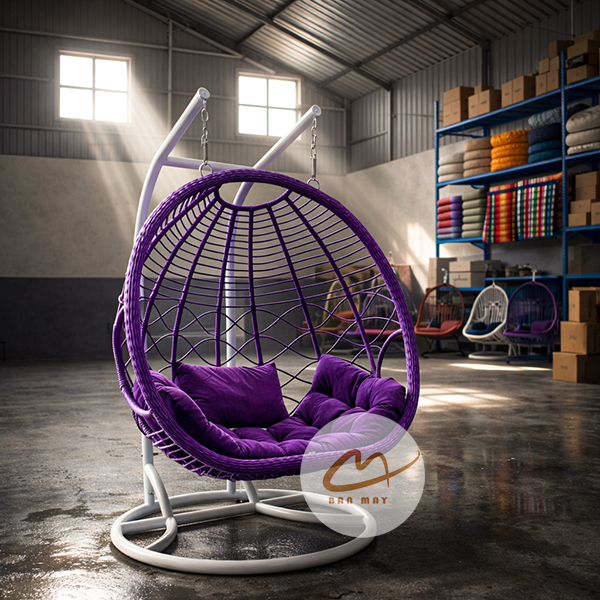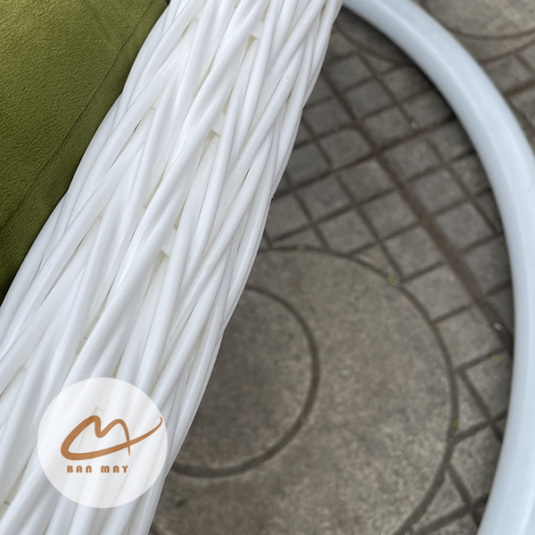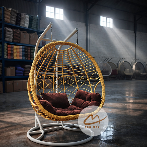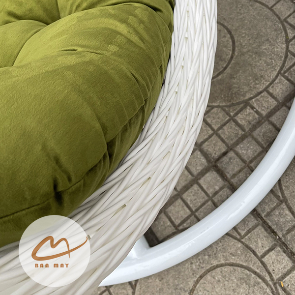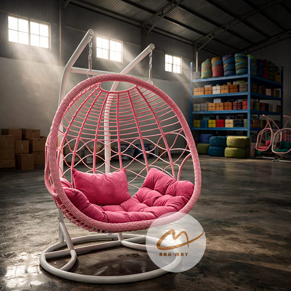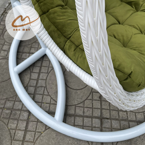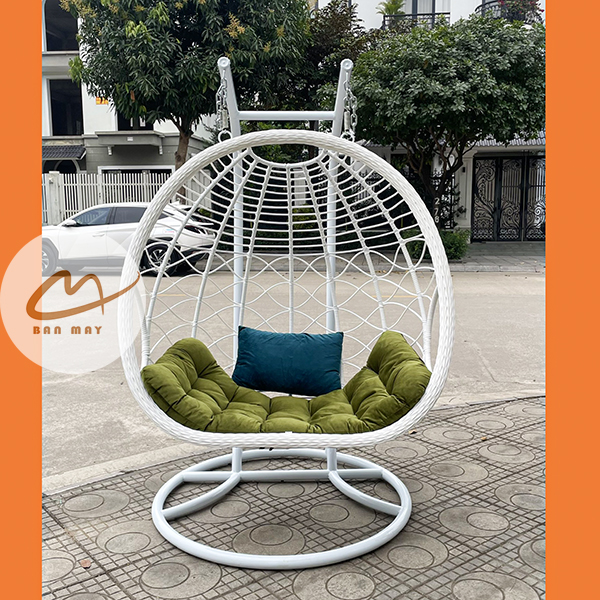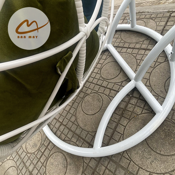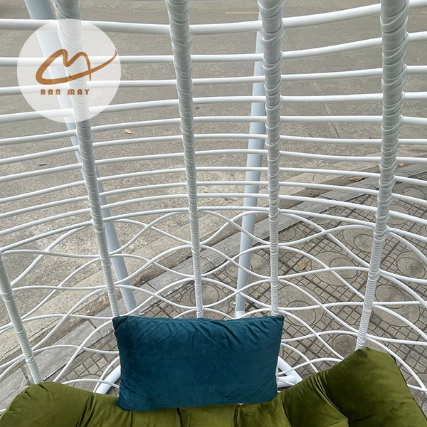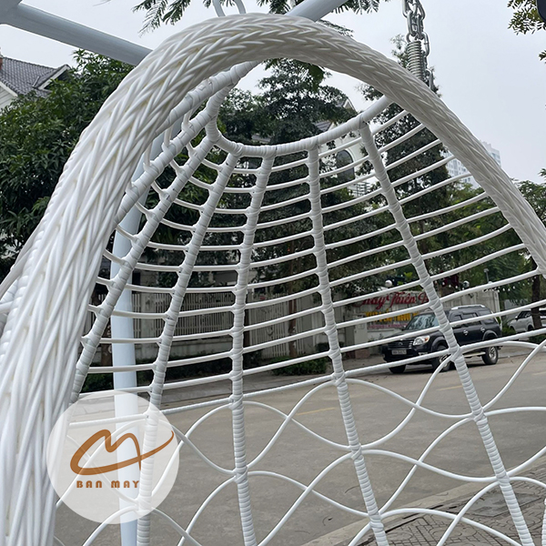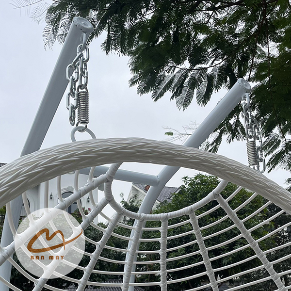 Lồng thép bên trong đóng vai trò chịu lực chính, trong khi lớp nhựa nguyên sinh giả mây bao phủ bên ngoài tạo hiệu ứng thị giác tự nhiên. Nhờ vậy, sản phẩm giữ được độ chắc chắn mà vẫn mang cảm giác mềm mại. Việc cho phép tùy chỉnh màu khung và màu lồng giúp mẫu ghế xích đu này thích nghi linh hoạt với nhiều phong cách kiến trúc: hiện đại tối giản, resort nhiệt đới hay sân vườn châu Âu cổ điển.