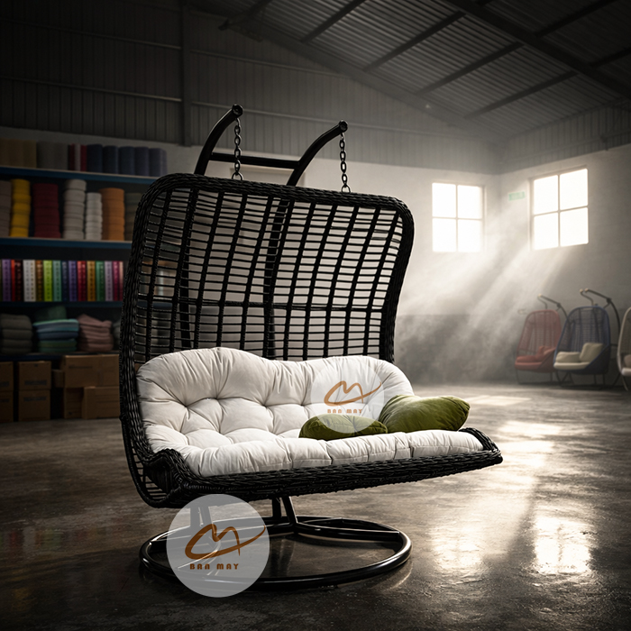 Có những mẫu xích đu chỉ để ngồi một mình. Nhưng cũng có những thiết kế sinh ra để trở thành trung tâm của không gian. Mẫu Xích đu mây nhựa lưng vòm đôi thuộc nhóm thứ hai. Ngay từ cái nhìn đầu tiên, form lưng cong cao 2m tạo cảm giác bề thế và cân đối. Lồng rộng 1m3 mở ra không gian ngồi rộng rãi, khác biệt hoàn toàn so với những mẫu ghế xích đu đơn thông thường. Đây không chỉ là nơi thư giãn cá nhân mà là khu vực quây quần cho 2–3 người cùng lúc.
