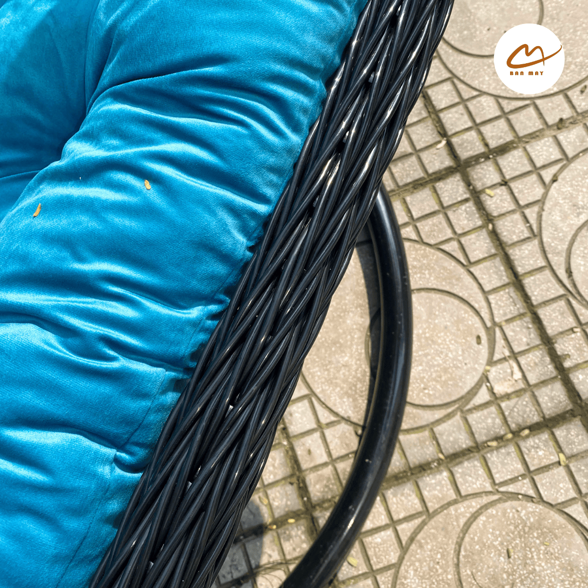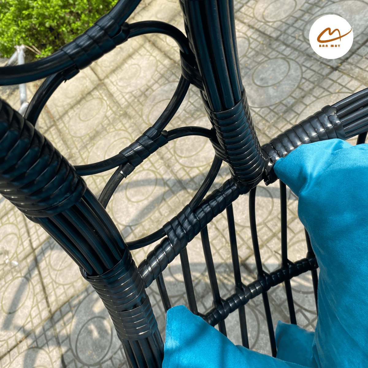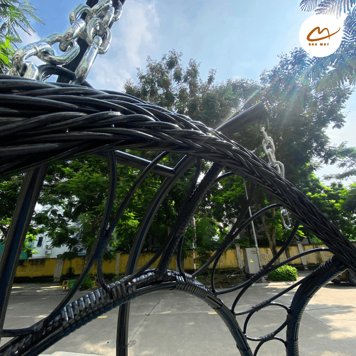 Lồng thép kết hợp nhựa nguyên sinh giả mây giúp giữ được vẻ tự nhiên nhưng không lo mốc, mục hoặc mối mọt. Đây là lợi thế lớn so với mây tự nhiên khi sử dụng dài hạn ngoài trời. Khung và lồng đều có thể tùy chỉnh màu theo yêu cầu. Điều này giúp mẫu ghế xích đu dễ dàng hòa hợp với tổng thể kiến trúc: từ phong cách tối giản, hiện đại đến biệt thự sân vườn cổ điển.