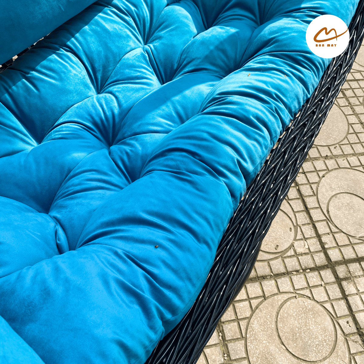 Đệm nhung cao cấp 2 lớp nhồi 100% bông hạt trắng tạo độ đàn hồi tốt. Khi ba người cùng ngồi, đệm vẫn giữ form và không bị lún sâu quá mức. Gần 100 màu đệm tùy chọn cho phép cá nhân hóa theo phong cách sân vườn. Từ tông trầm sang trọng đến màu sáng nổi bật, sản phẩm có thể trở thành điểm nhấn trung tâm ngoài trời.