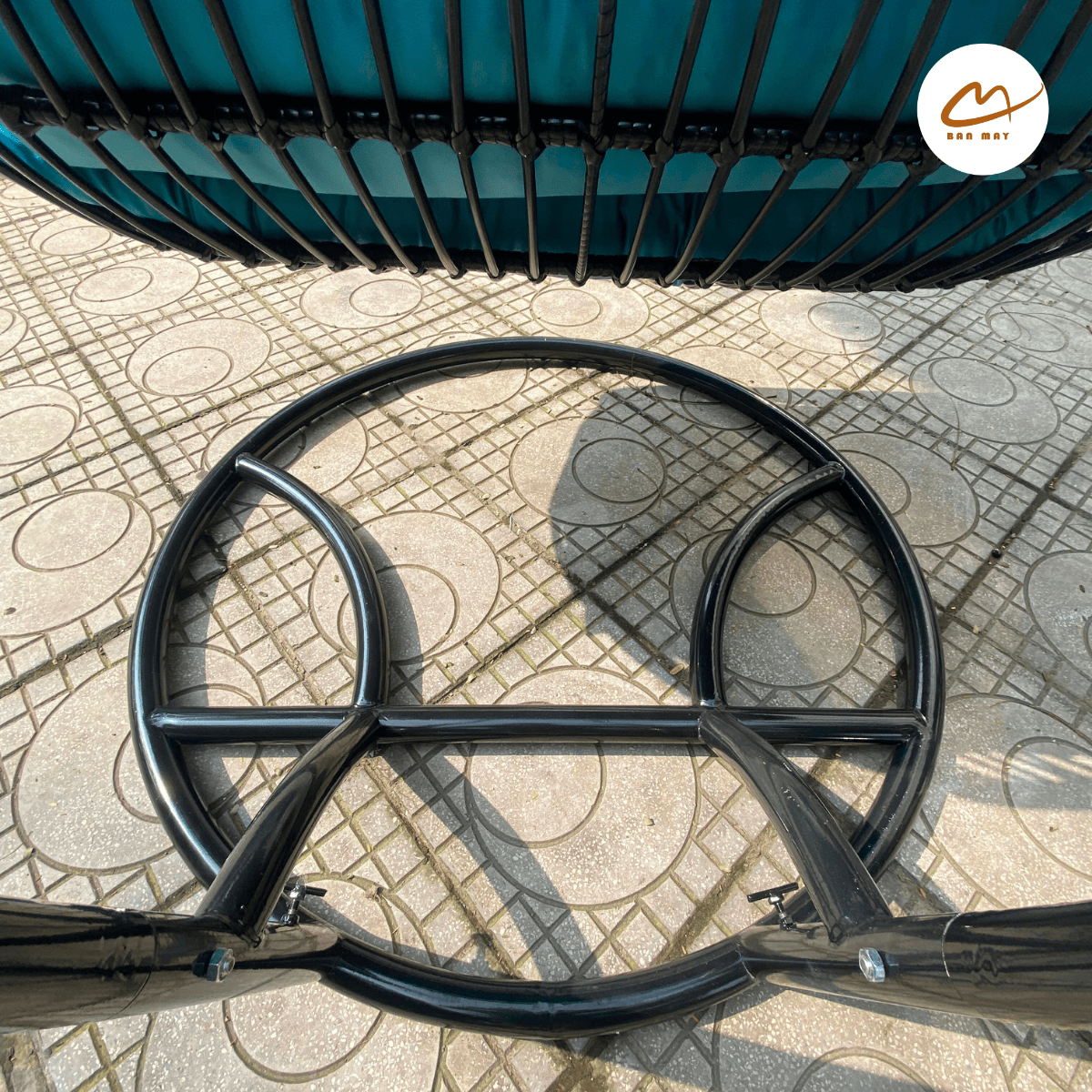 Không phải mẫu xích đu nào cũng đủ rộng để ba người lớn cùng ngồi thoải mái. Với lồng rộng 1m3 và tải trọng 300kg, mẫu xích đu sân vườn bán nguyệt cần kép được thiết kế cho những không gian ngoài trời cần một điểm tụ họp thực sự. Dáng bán nguyệt mở rộng theo chiều ngang giúp người ngồi có đủ khoảng cách vai và lưng, không bị chật khi ngồi cạnh nhau.