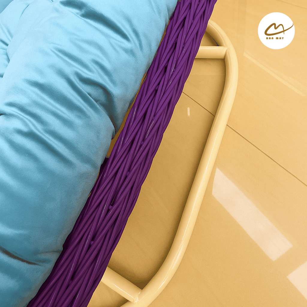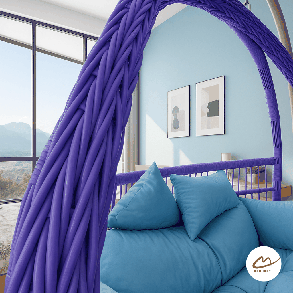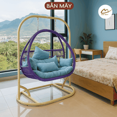 Chiếc xích đu của Bản Mây được trang bị đệm nhung 2 lớp cao cấp, màu xanh biển nhẹ nhàng, vừa nổi bật trên nền tím, vừa mang lại cảm giác thư thái cho người dùng. Bên trong đệm được nhồi 6 cân bông hạt trắng, giữ form lâu, không xẹp lún, đảm bảo độ êm tối đa khi ngồi đọc sách, thư giãn hay chợp mắt ngắn.