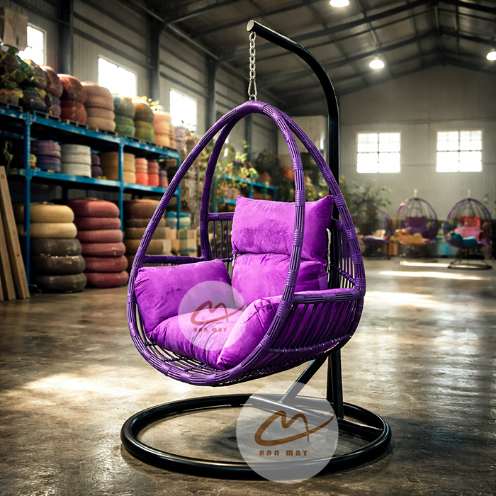Về thiết kế, form trứng khủng long tạo cảm giác ôm trọn cơ thể khi ngồi. Lồng rộng 1m đủ cho 1–2 người sử dụng. Kết cấu chịu tải an toàn 200kg giúp người dùng yên tâm hơn khi sử dụng lâu dài. So với các mẫu ghế xích đu mây tự nhiên cùng phân khúc, phiên bản mây nhựa thường có giá thành thấp hơn đáng kể nhưng độ bền lại cao hơn.
